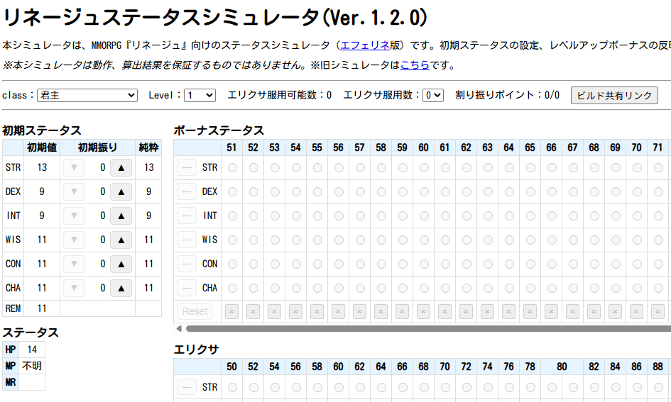 また、全クラスのレベル上昇に伴うステ上昇値(MRとか命中とか)の検証中。あと、ビルド共有リンク機能に対応したので、他者とのステータスの共有が可能に。